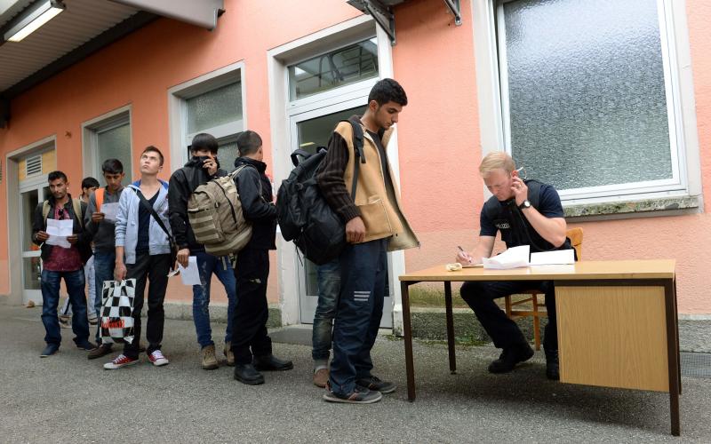 A German police officer registering refugees who travelled through Hungary and Austria, at a train station in Freilassing on Sept 15, 2015.