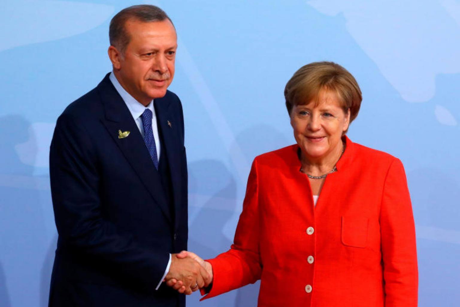 Turkish President Recep Tayyip Erdogan shakes hands with German Chancellor Angela Merkel as he arrives for the G20 leaders summit in Hamburg, Germany, on July 7, 2017.