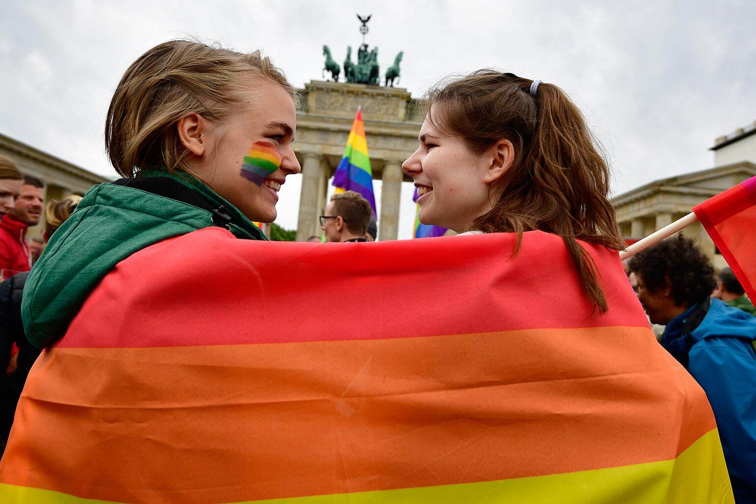 Two young women wrapped into a rainbow flag as they attend a rally of gays and lesbians in front of the Brandenburg Gate in Berlin, on June 30, 2017.