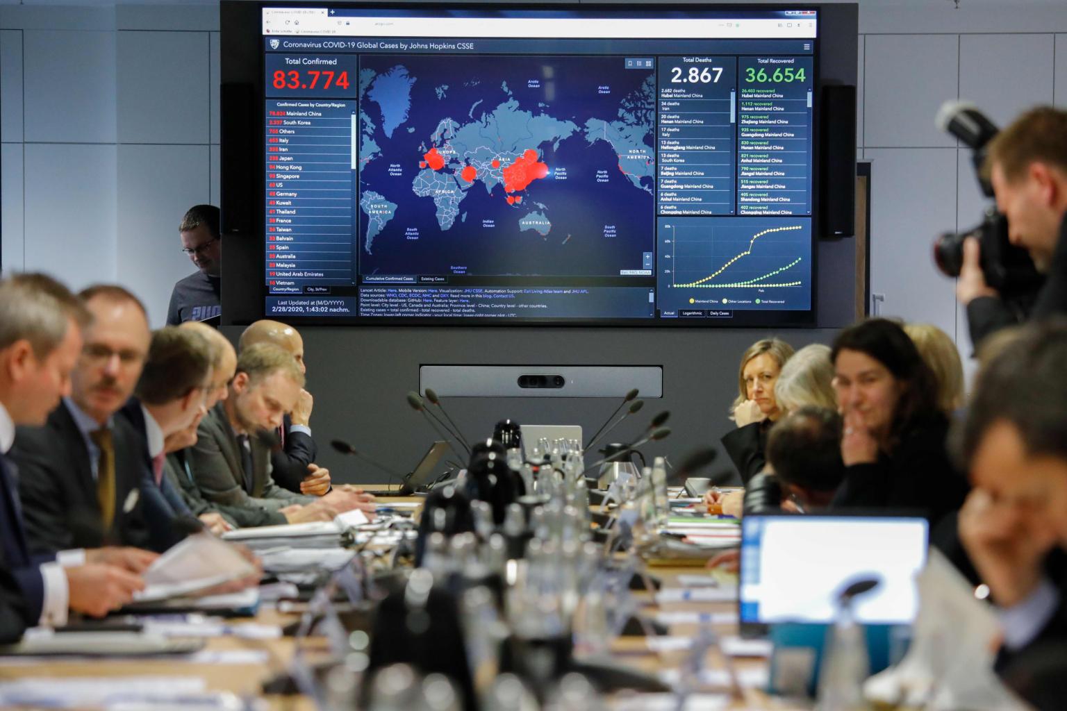 Members of the joint Coronavirus crisis unit of the Ministry of Health and the Ministry of the Interior attend a meeting in Berlin, on Feb 28, 2020.