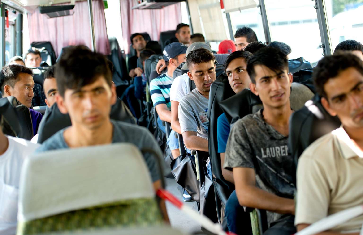Afghan refugees aboard a federal police bus at a refugee registration centre in Passau, Germany.