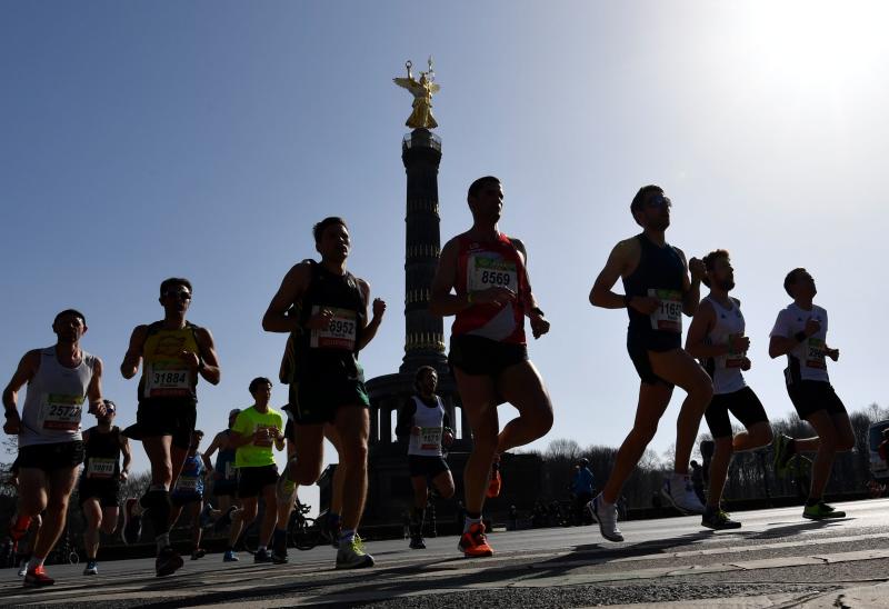 Runners compete during the half-marathon in Berlin on April 8, 2018.