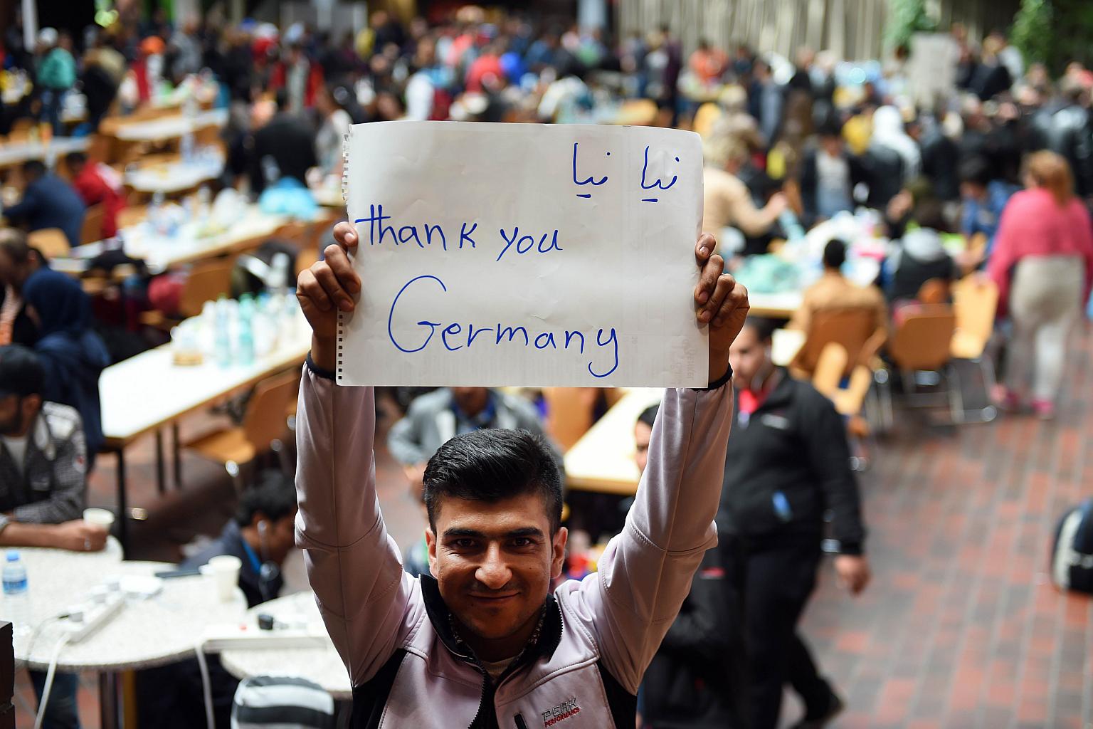 A migrant holds a paper with the words "Thank you Germany" while waiting for a bus after his arrival at the train station in Dortmund on Sept 6, 2015.