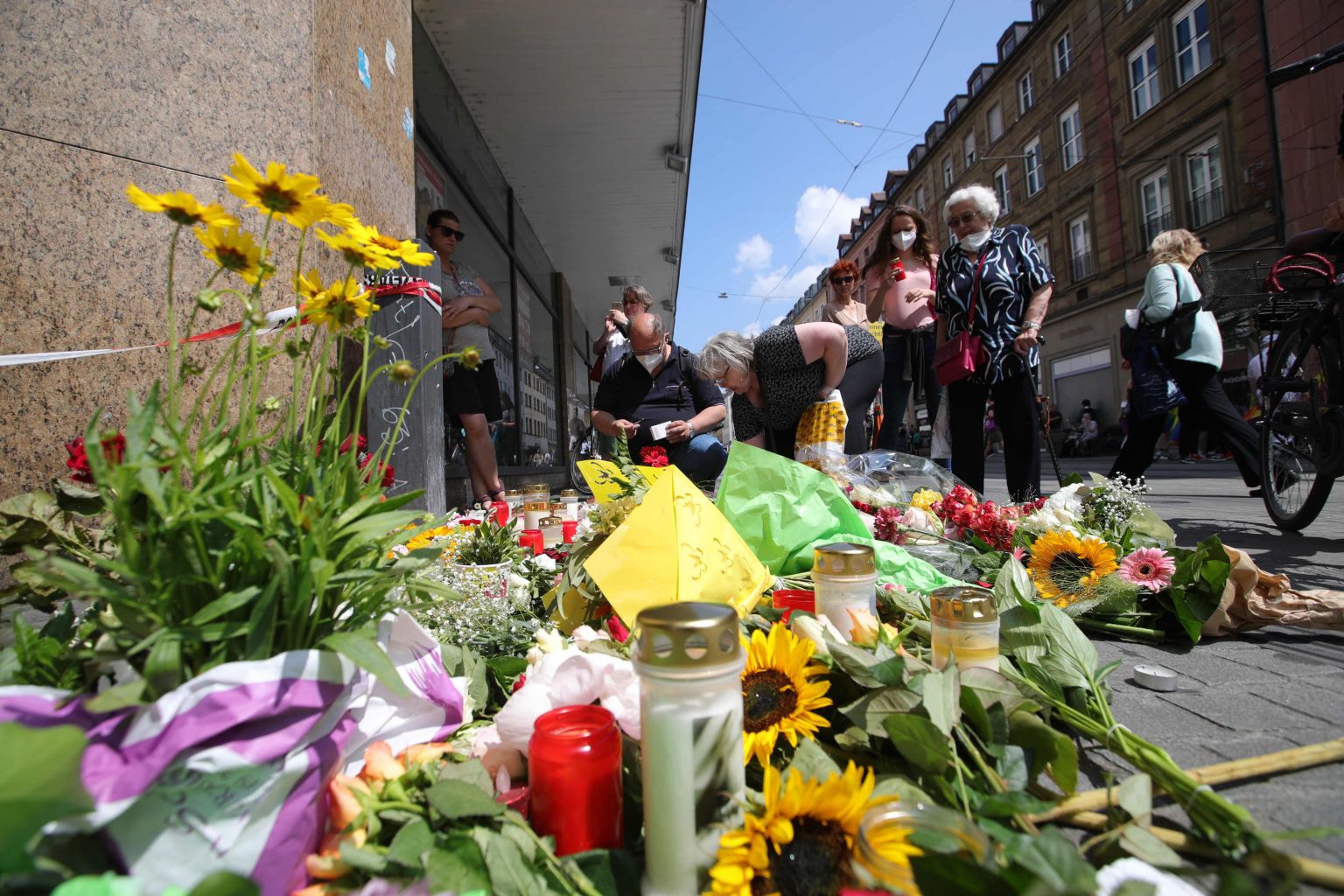 People place flowers and candles at a makeshift memorial in the centre of Wuerzburg, on June 26, 2021.
