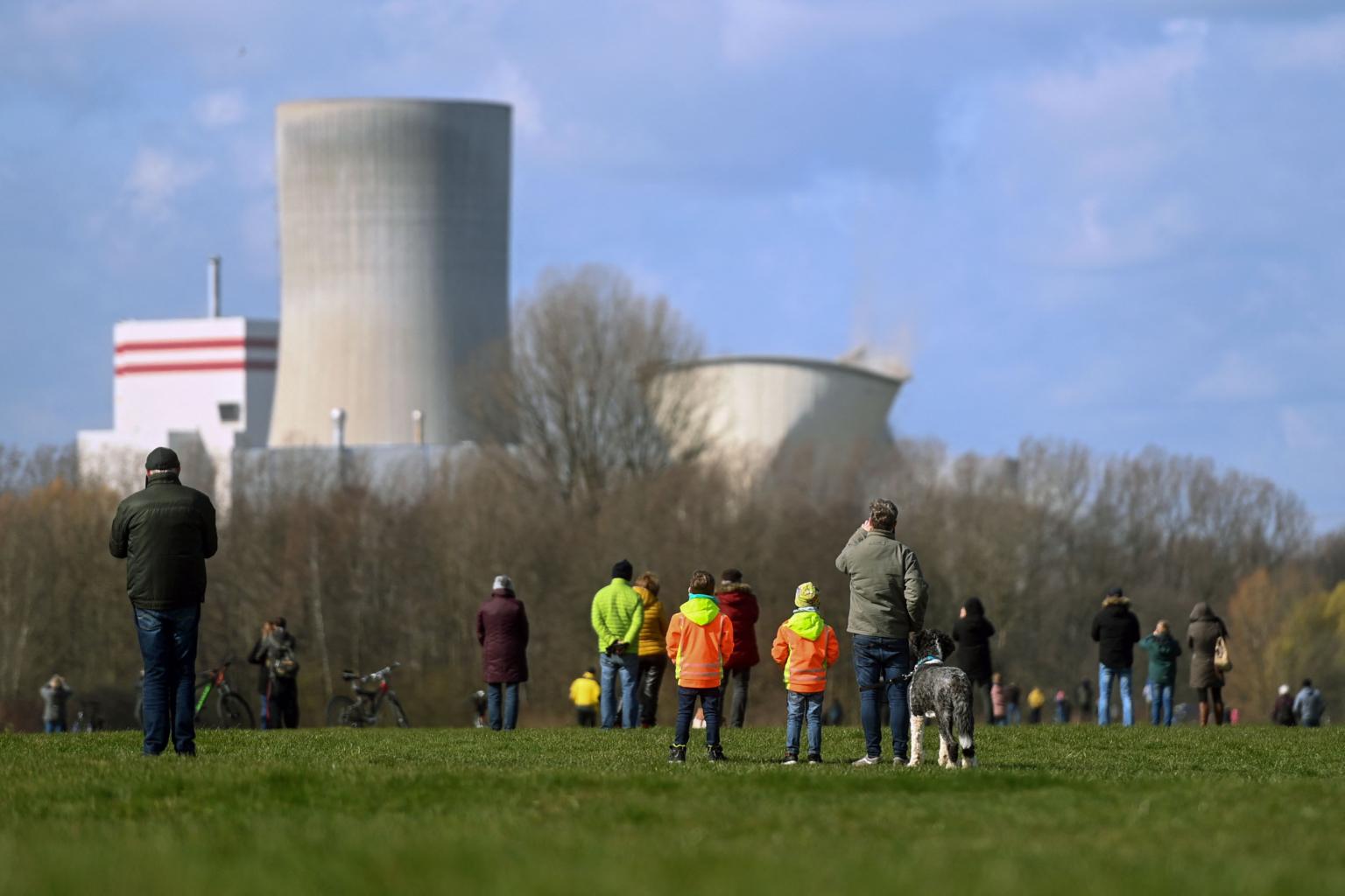 People look on as a coal-fired power station is destroyed via controlled explosion in Luenen, western Germany, on March 28, 2021.