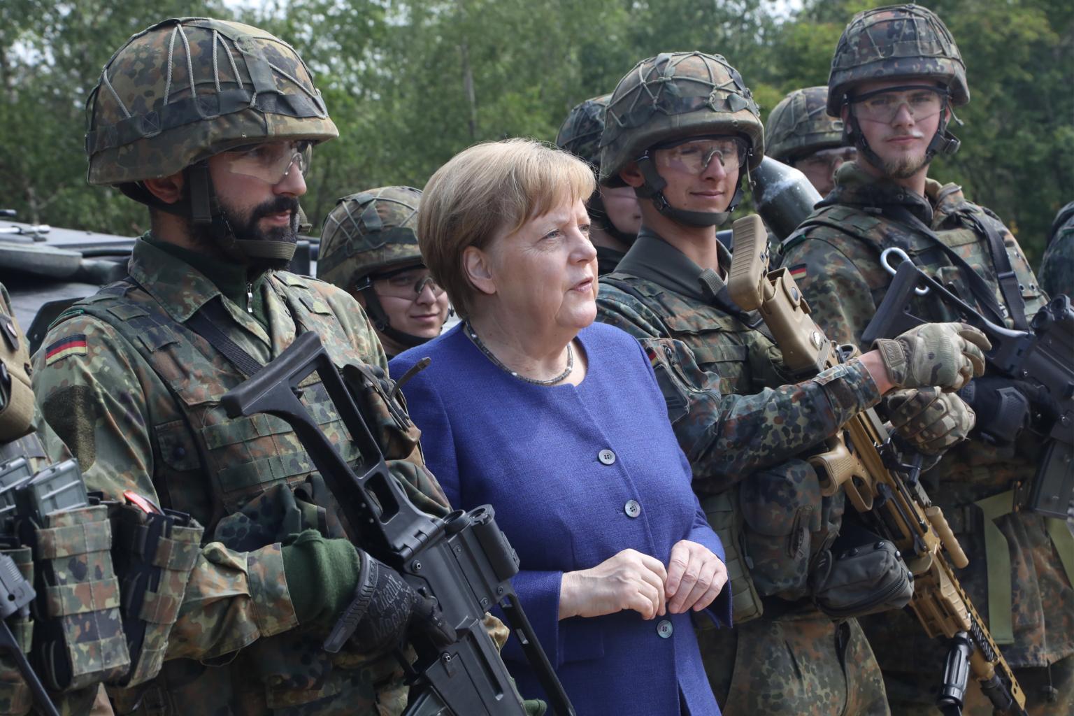 German Chancellor Angela Merkel with soldiers during her visit at the NATO Very High Readiness Task Force Land (VJTF L 2019) exercise in Muenster, Germany, on May 20, 2019.