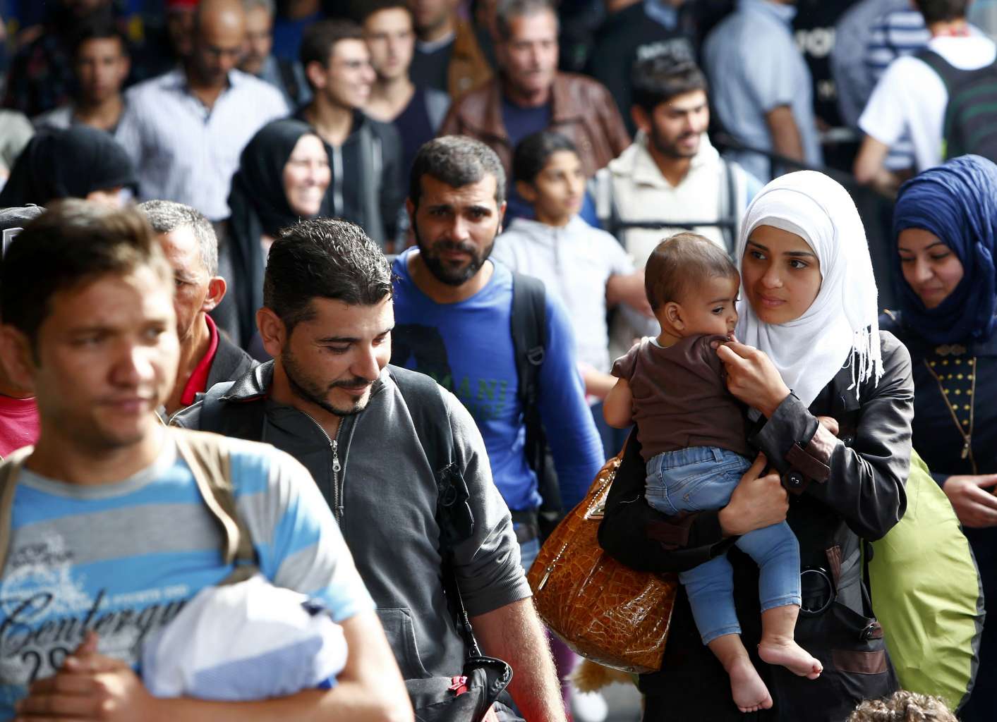 Migrants walk on the platform after arriving by train at the main railway station in Munich, Germany, on Sept 13, 2015.