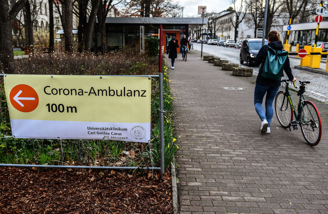 A Coronavirus clinic sign hangs at the entrance to the Dresden University Hospital in Dresden, Germany, on March 9, 2020.