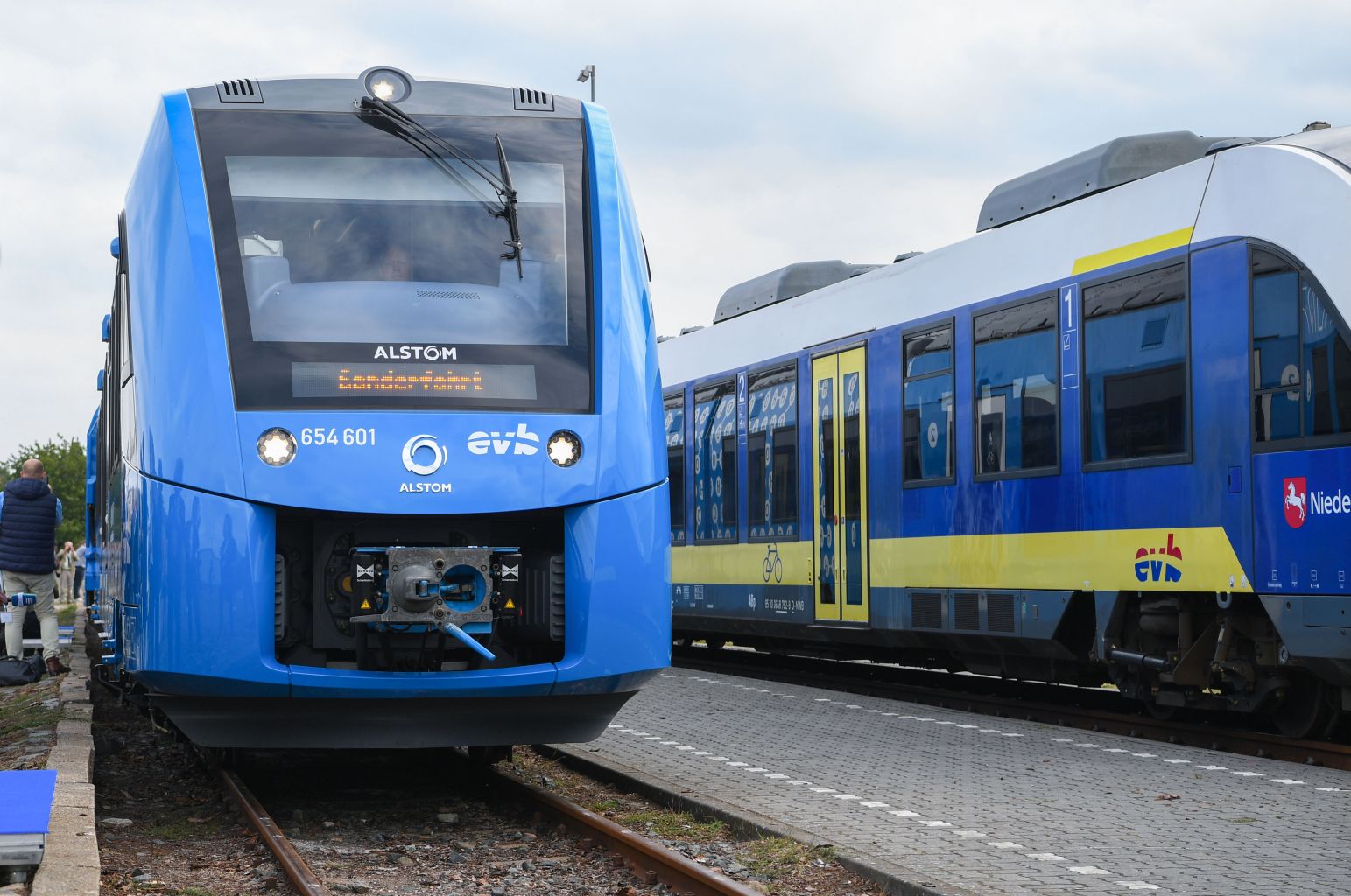 Two bright blue Coradia iLint trains, built by French TGV-maker Alstom, began running a 100-kilometre route between the towns and cities of Cuxhaven, Bremerhaven, Bremervoerde and Buxtehude in northern Germany - a stretch normally plied by diesel trains.