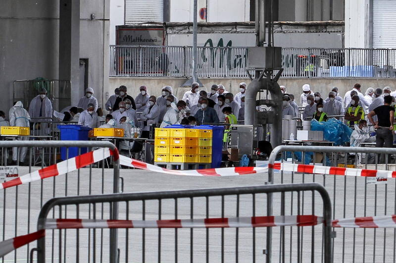 Soldiers taking coronavirus tests from workers at the Toennies meat factory in Rheda-Wiedenbrueck, western Germany, on June 19, 2020.