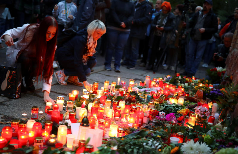 People place candles outside the synagogue in Halle, Germany on Oct 11, 2019, after two people were killed in a shooting.