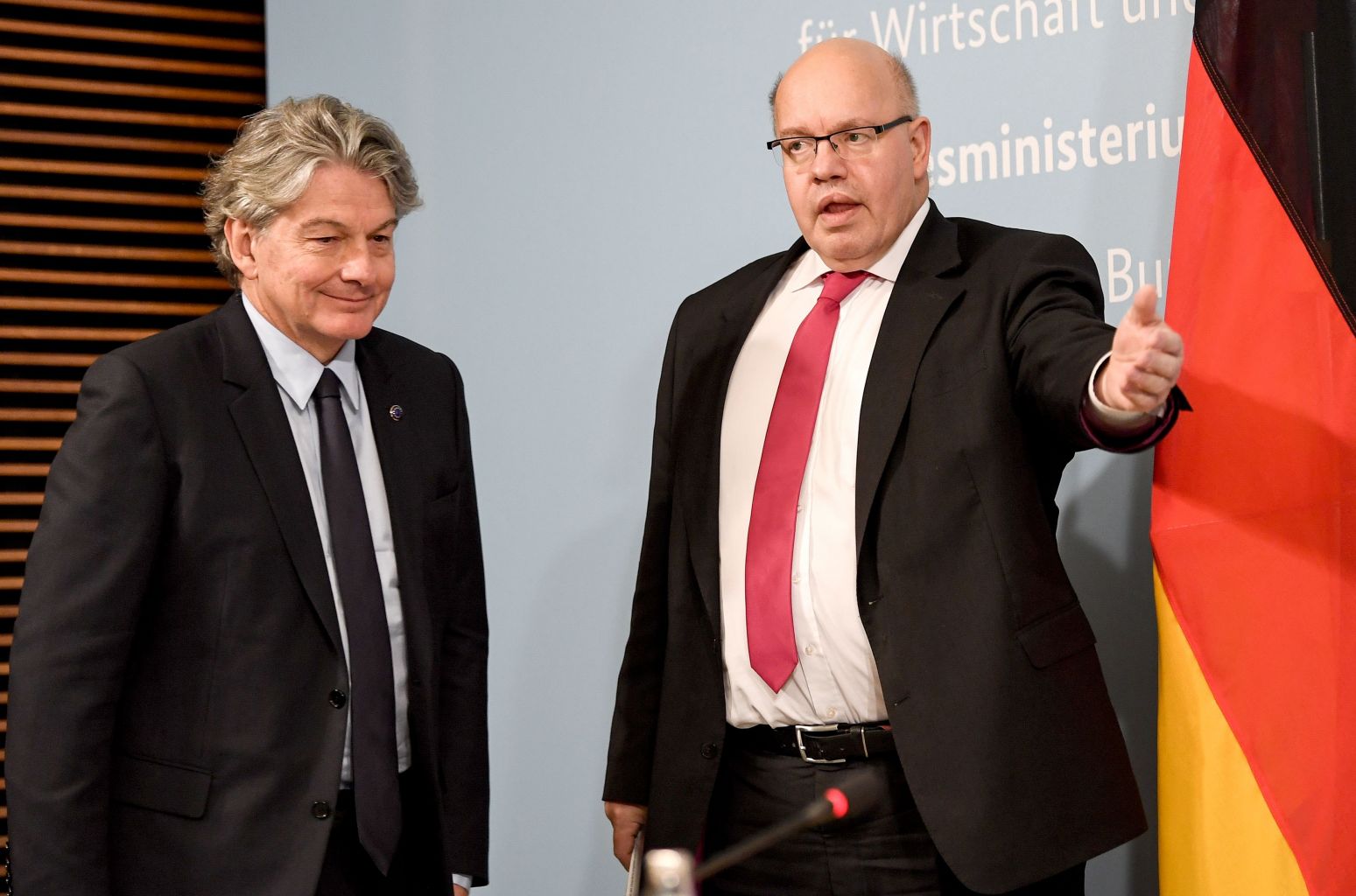 German Economy Minister Peter Altmaier (right) and European Commissioner in charge of the Internal Market Thierry Breton arrive to give a press conference.