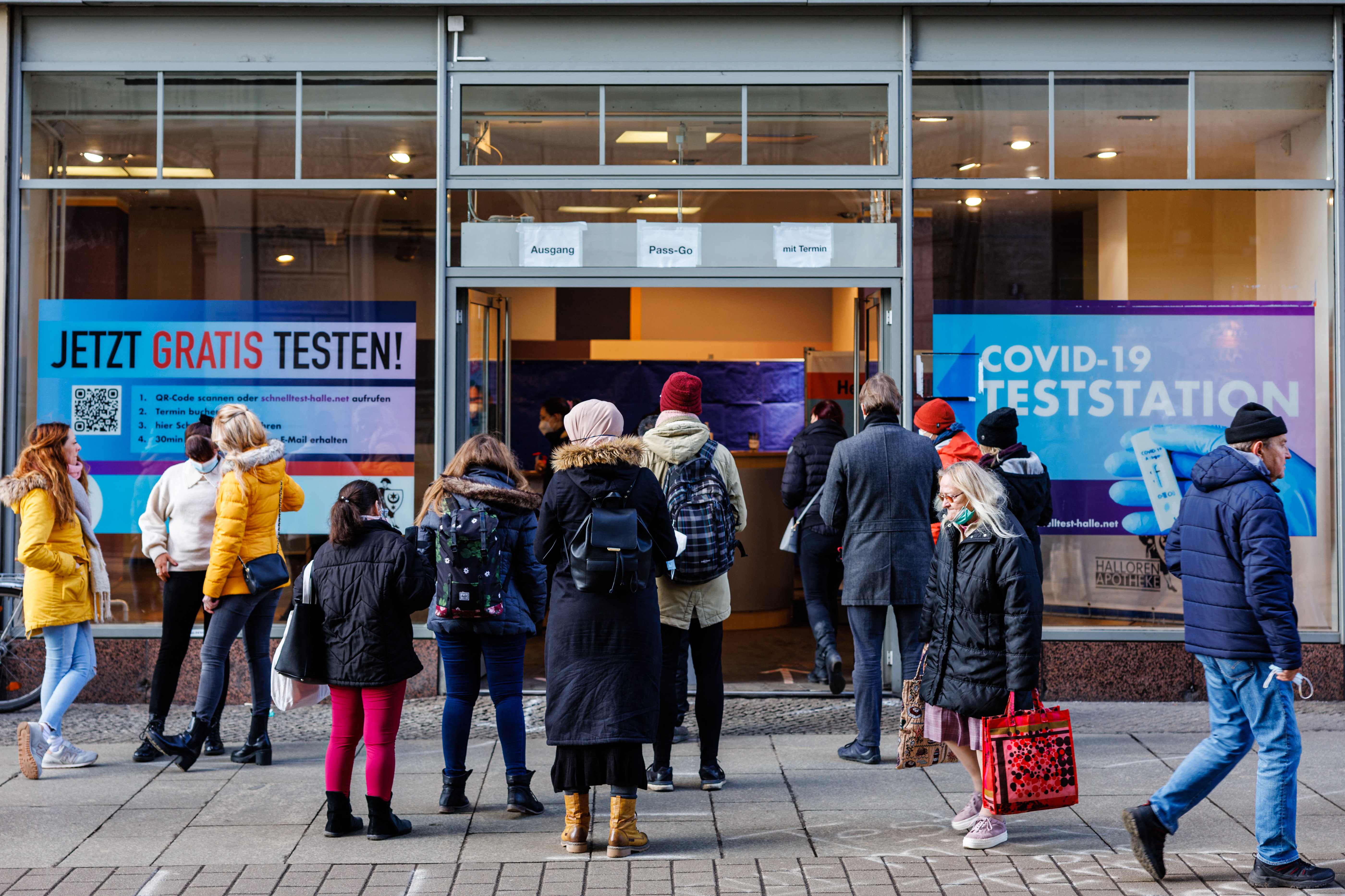 People wait in front of a Covid-19 test centre in Halle, Germany, on Jan 19, 2022.