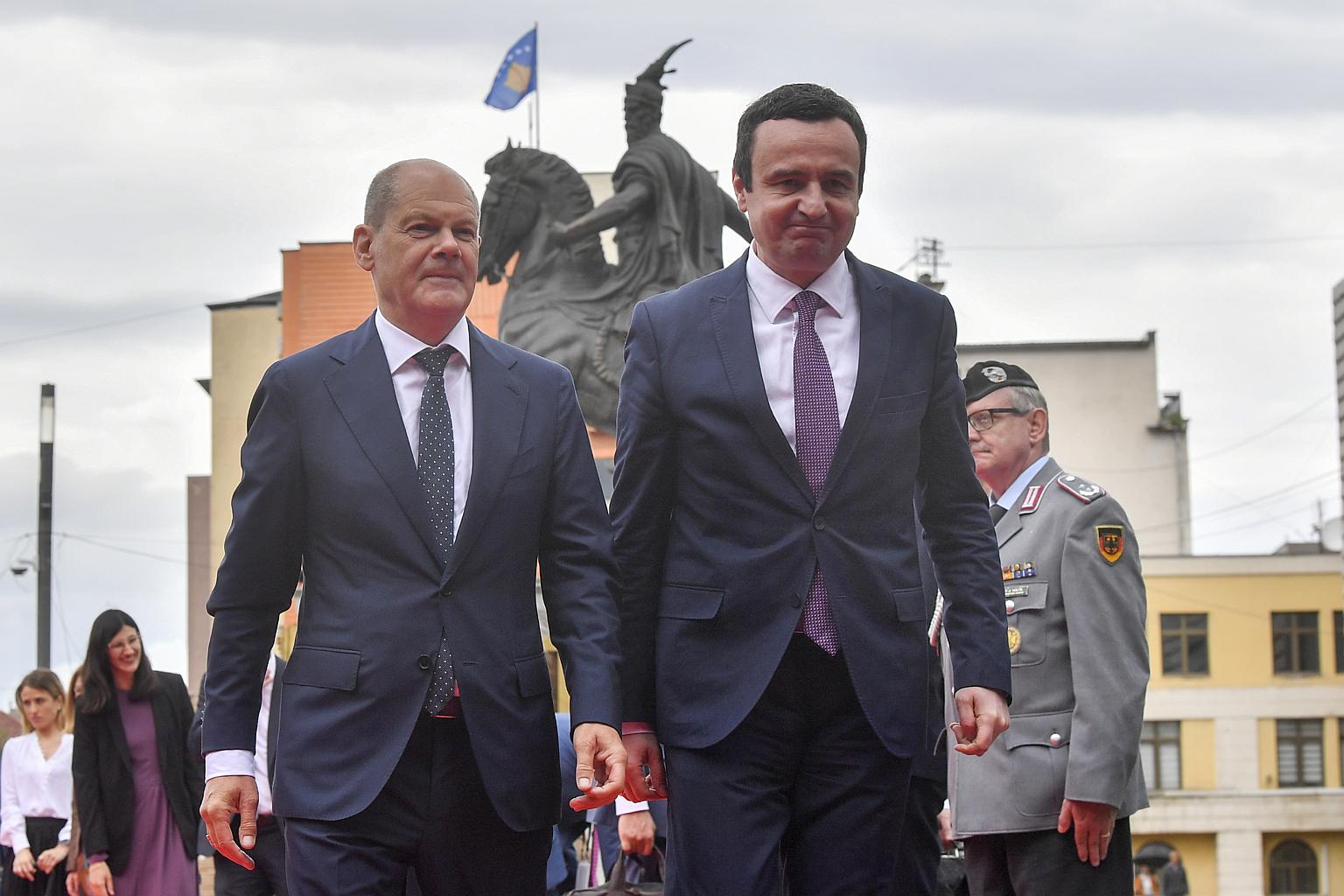 Kosovo's PM Albin Kurti (right) welcomes German Chancellor Olaf Scholz to Pristina, Kosovo, on June 10, 2022.