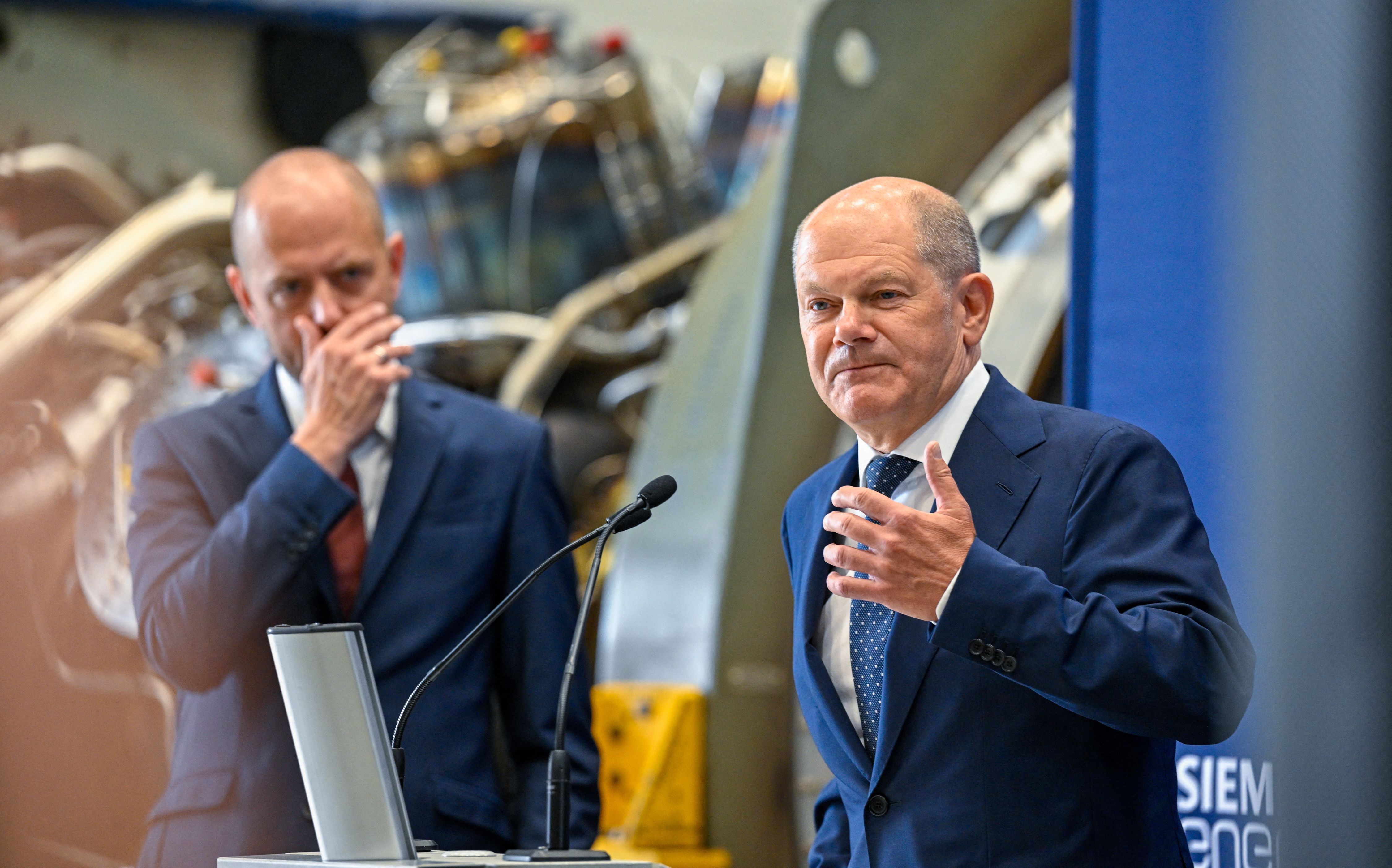 German Chancellor Olaf Scholz (right) addresses the media during a visit to Siemens Energy in Mulheim an der Ruhr.