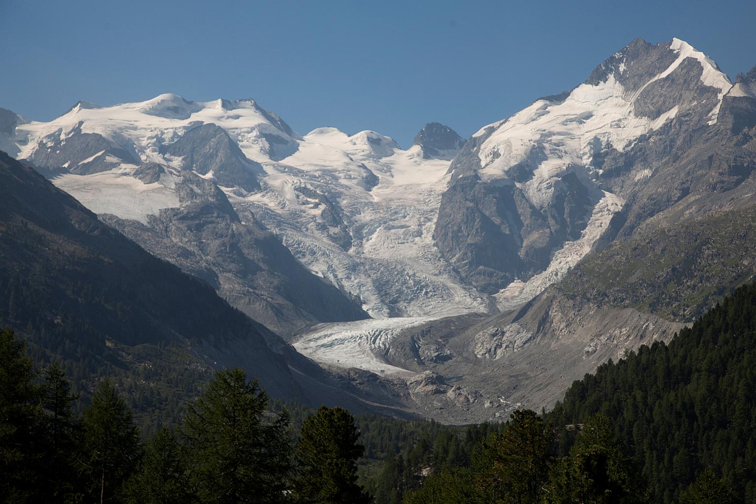 Already, Morteratsch is much changed from the glacier depicted on the region's tourist maps. The long tongue that once reached deep into the valley below has shrunk back by nearly 3 kilometres, while the depth of the snow and ice pack has thinned by up to 200 metres. A parallel glacier Pers flowed into it until 2017 but has now receded so much that an expanding strip of grit lies between them.