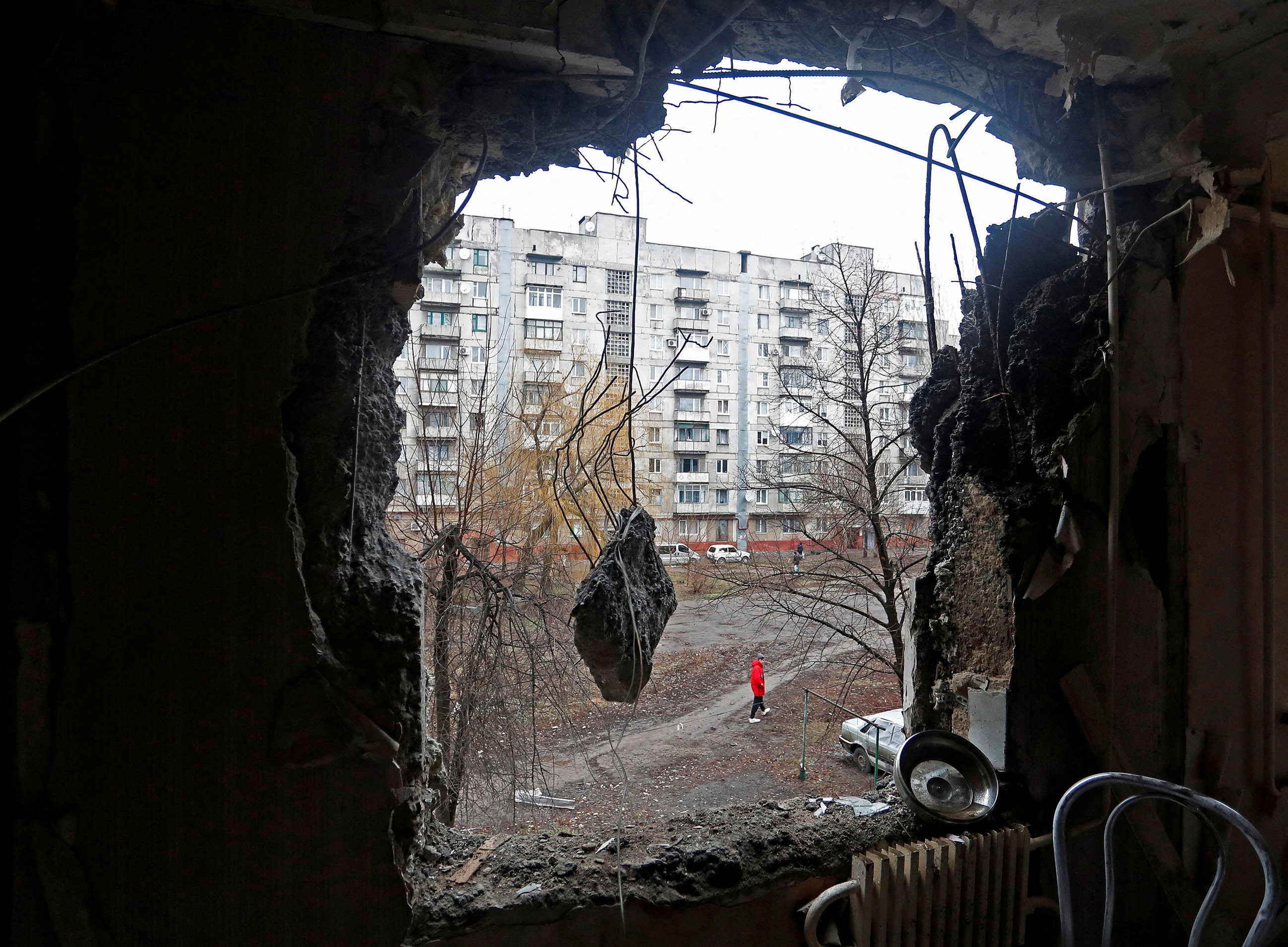 A person walks on the street amid destroyed residential buildings, in the Donetsk region of Ukraine, on March 2, 2022.