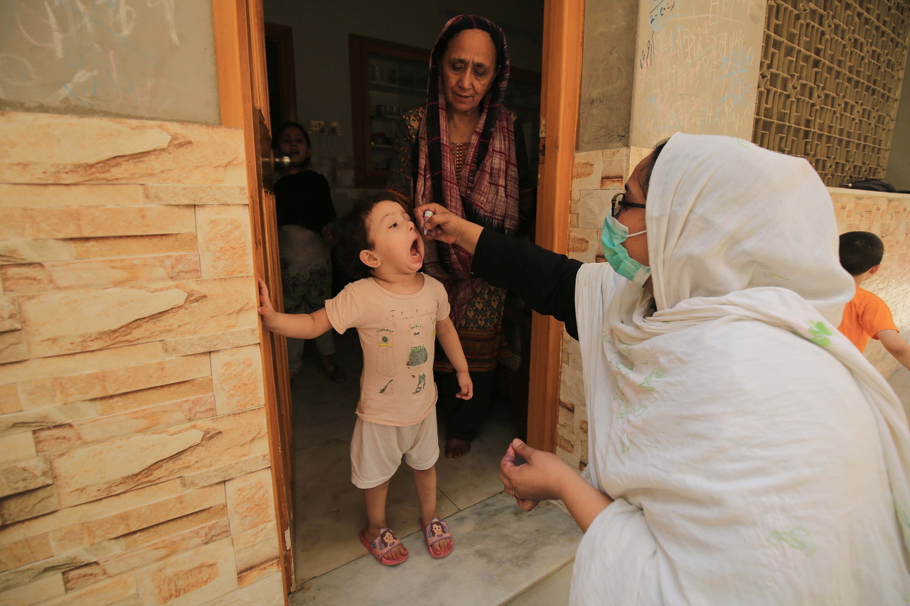 A health worker administers a polio vaccine to children in Peshawar, Pakistan, on June 7, 2021.