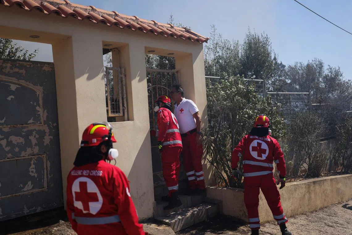 Hellenic Red Cross volunteers look for locals inside houses as a wildfire burns in the village of Thymari, near Athens, Greece.