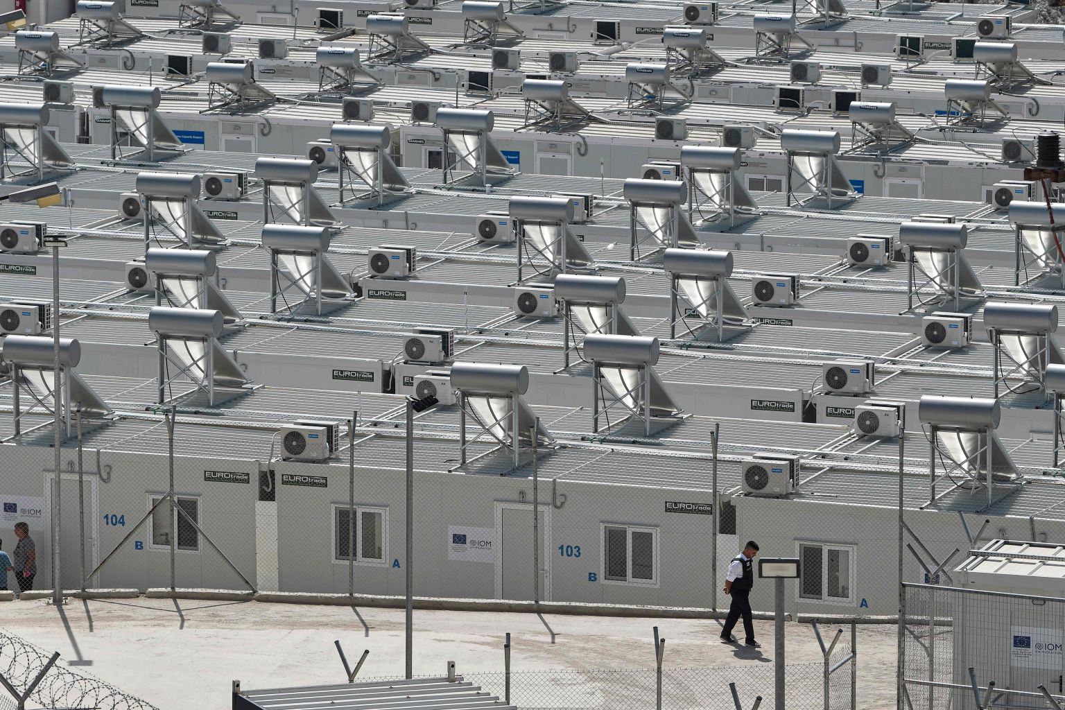 A security guard stands at the new EU-funded multi-purpose RIC (reception and Indentification centre) for migrants on the island of Samos.