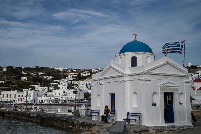 A woman sits next to a chapel in the old port of the Greek Cycladic island of Mykonos, on May 12, 2020.