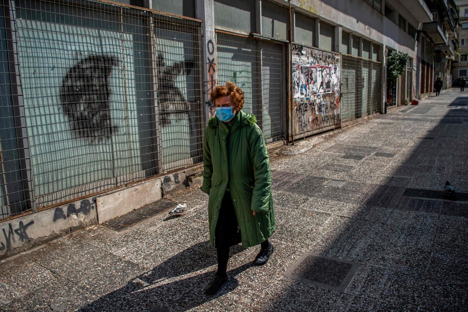 A woman wearing a protective mask walks in the centre of Athens, on March 11, 2020.