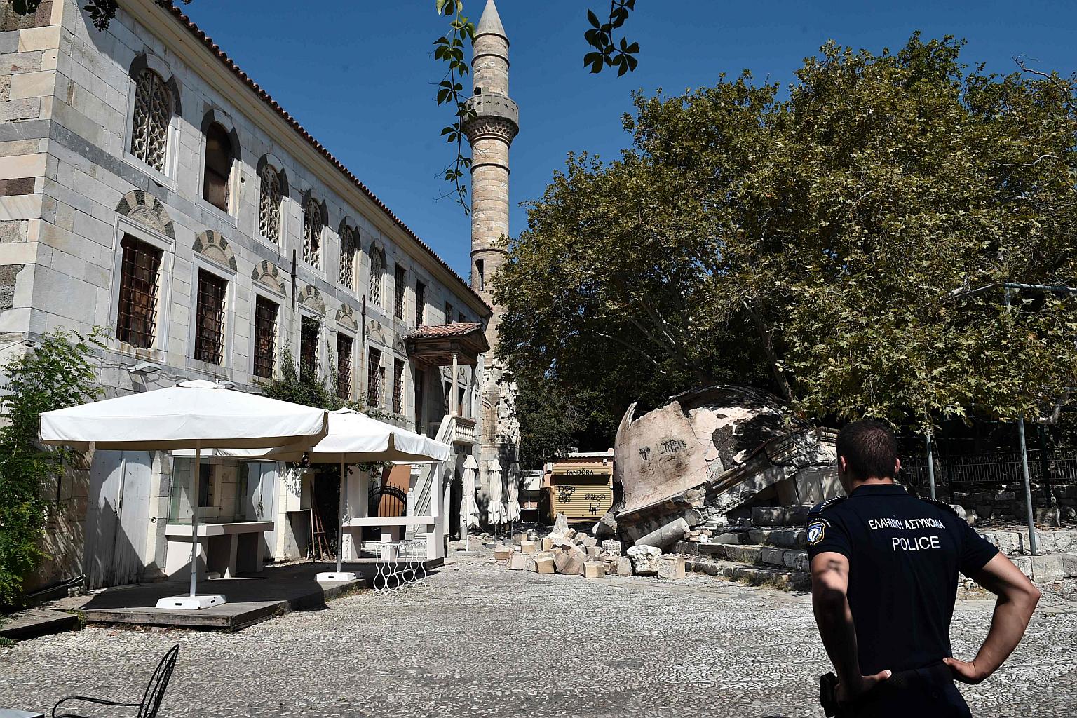 A policeman looks at a damaged mosque on the island of Kos on July 21, 2017, following a 6.5-magnitude earthquake which struck the region.