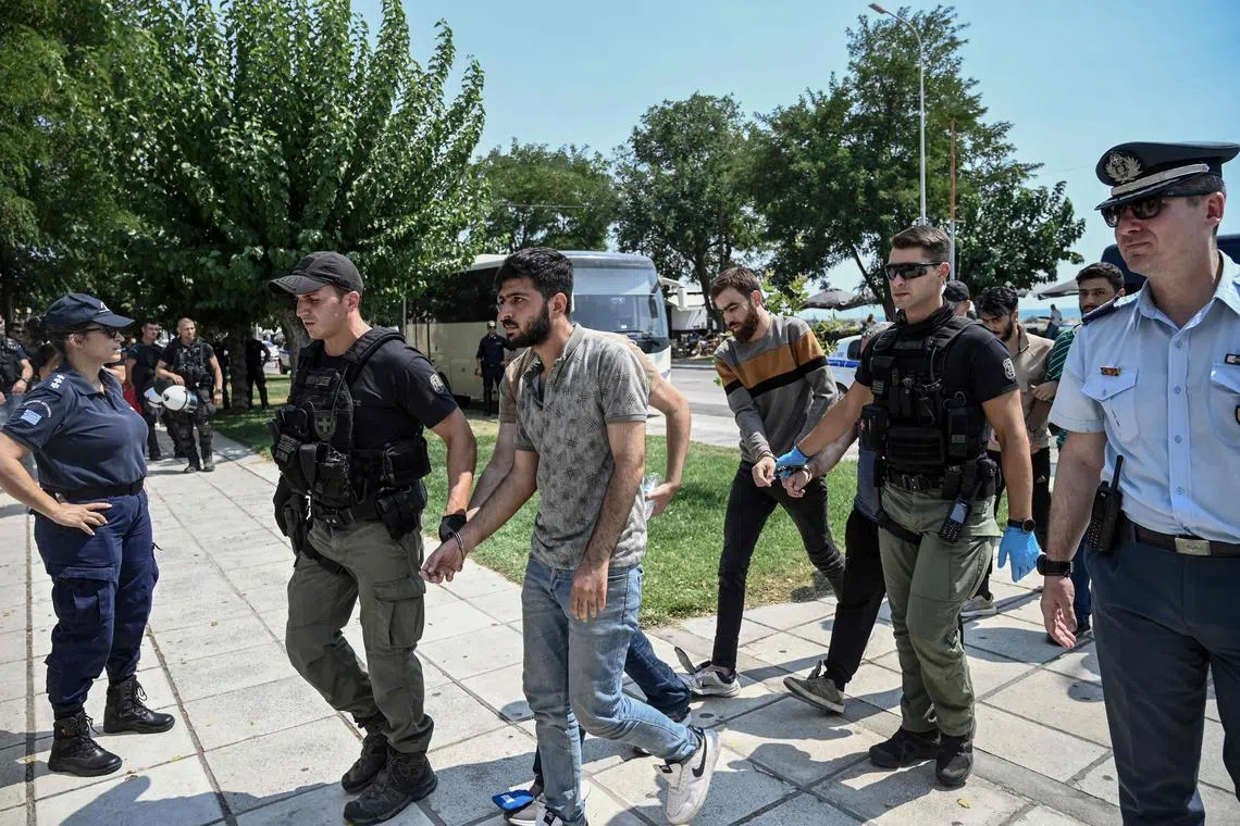 A group of 13 Pakistani and Syrian migrants charged with illegal entry and attempted arson are escorted to a courthouse in Alexandroupoli.