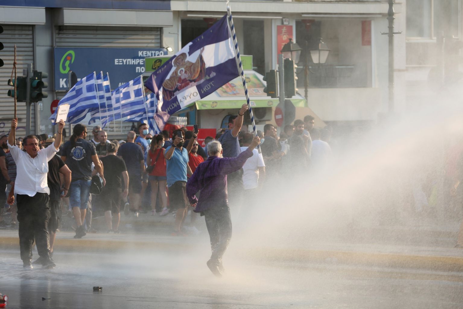 Greek riot police use water cannon to disperse protestors during an anti-vaccine protest held in Athens, Greece, on July 21, 2021.