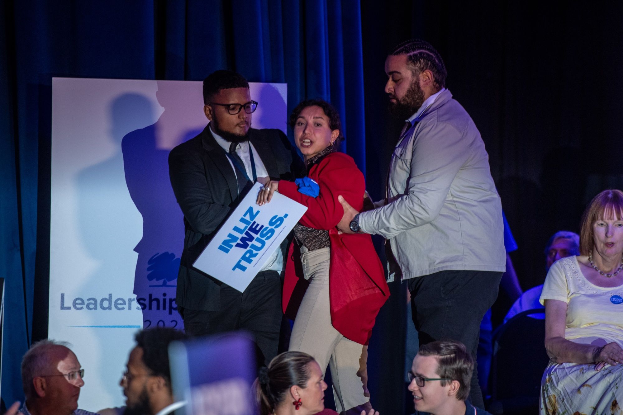 A protester is removed as Liz Truss, UK foreign secretary, not pictured, speaks during the Conservative Party leadership hustings in Eastbourne, Britain.