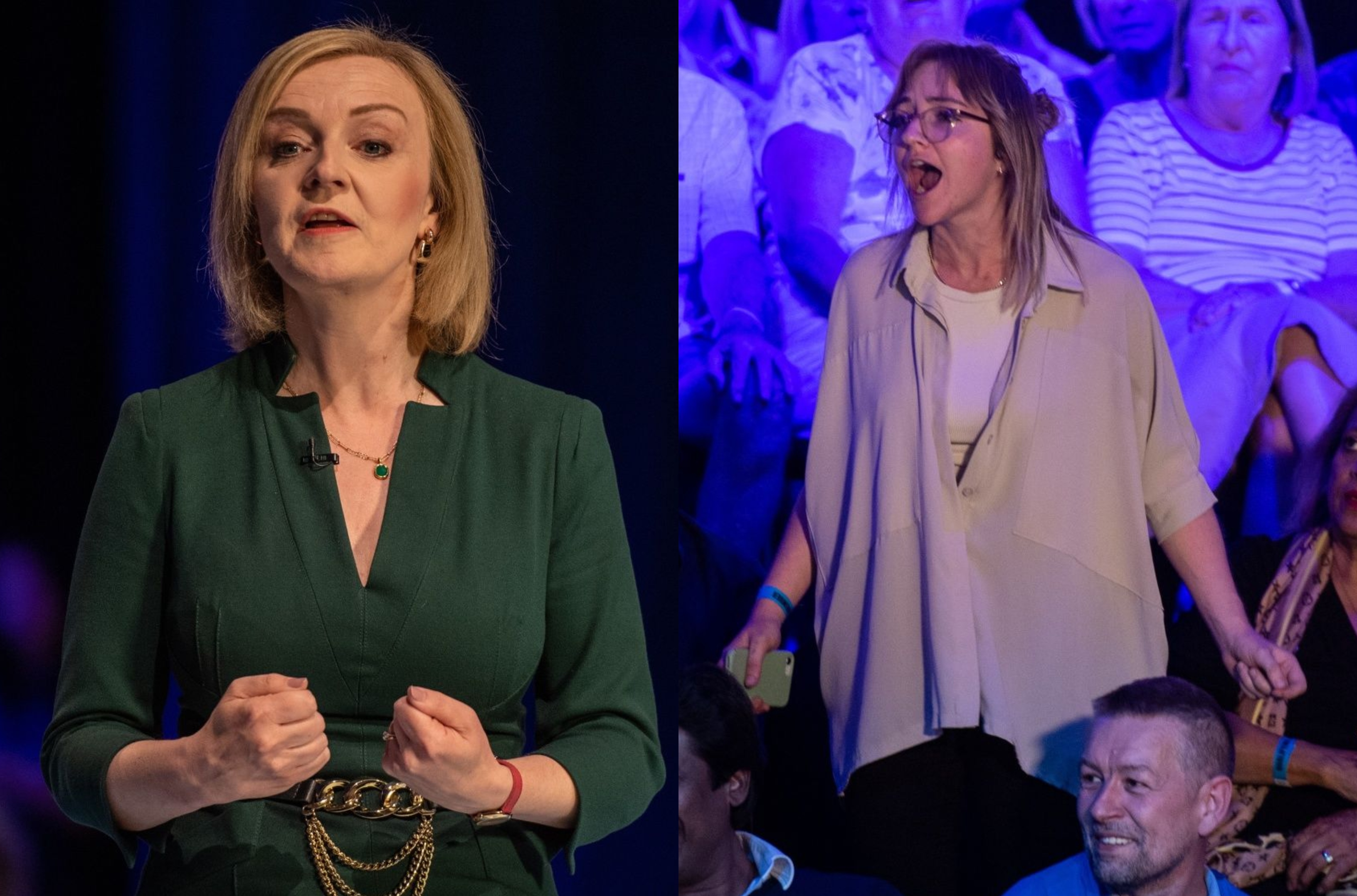 British PM hopeful Liz Truss (left) was interrupted by activists (right) from a group called Green New Deal Rising.
