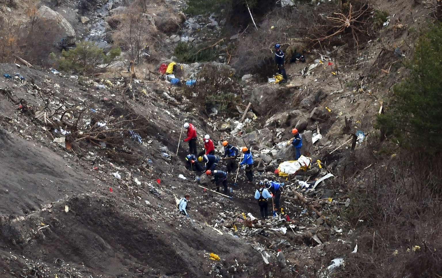 French gendarmes and investigators working in the scattered debris on the crash site of the Germanwings Airbus A320 on March 26, 2015.