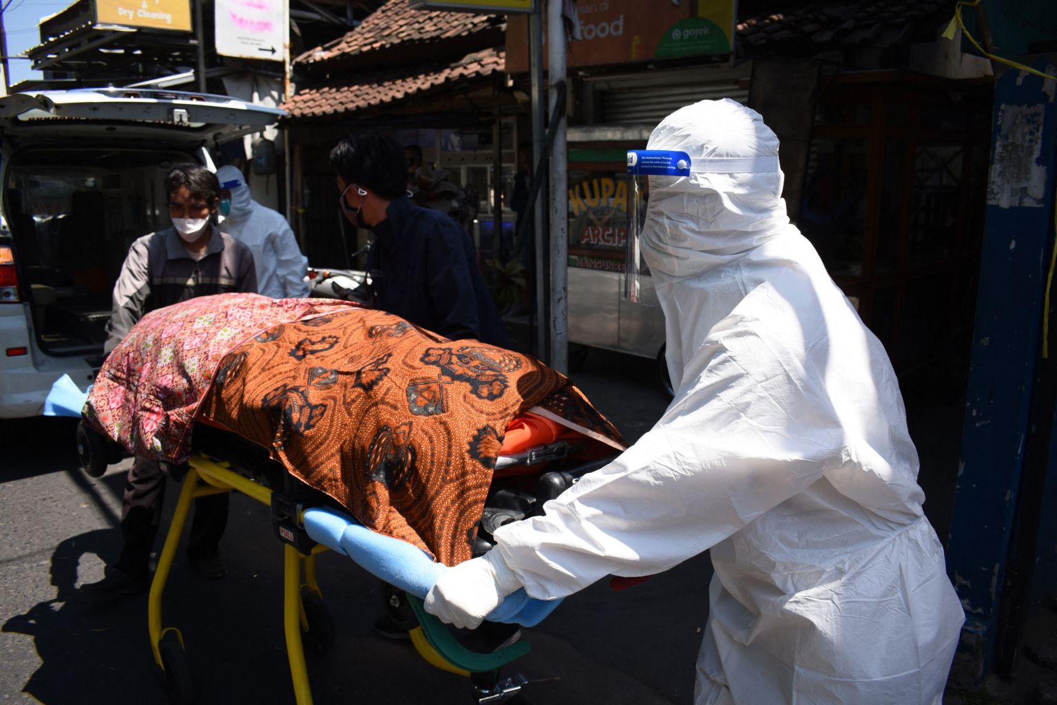 Health workers remove the body of a Covid-19 victim who died while isolating at home in Bandung, Indonesia, on July 28, 2021.