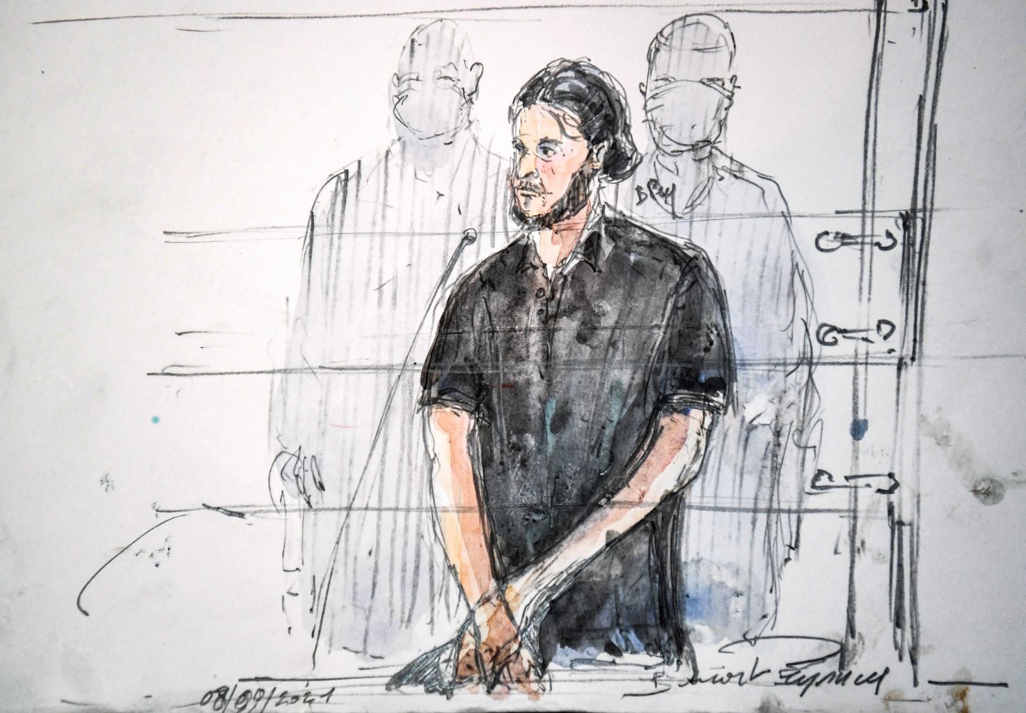 A court-sketch shows Salah Abdeslam, the prime suspect in the November 2015 Paris attacks, standing in the courtroom on the first day of the trial.