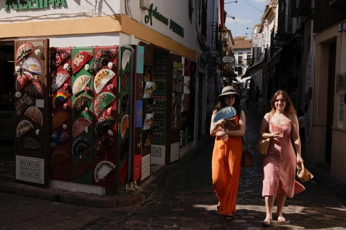 A tourist uses a hand fan to cool off as she tours in the strong sun, during a heat alert on a hot summer day in Spain, on June 23.