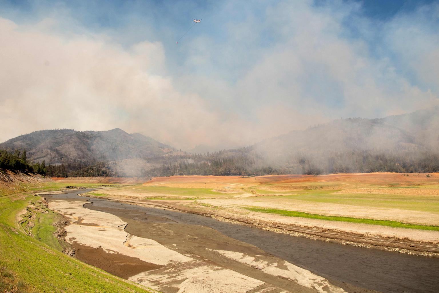 A water-dropping helicopter flies over burnt hills, flames and smoke at a drought-stricken Shasta Lake in Lakehead, California, on July 1, 2021.