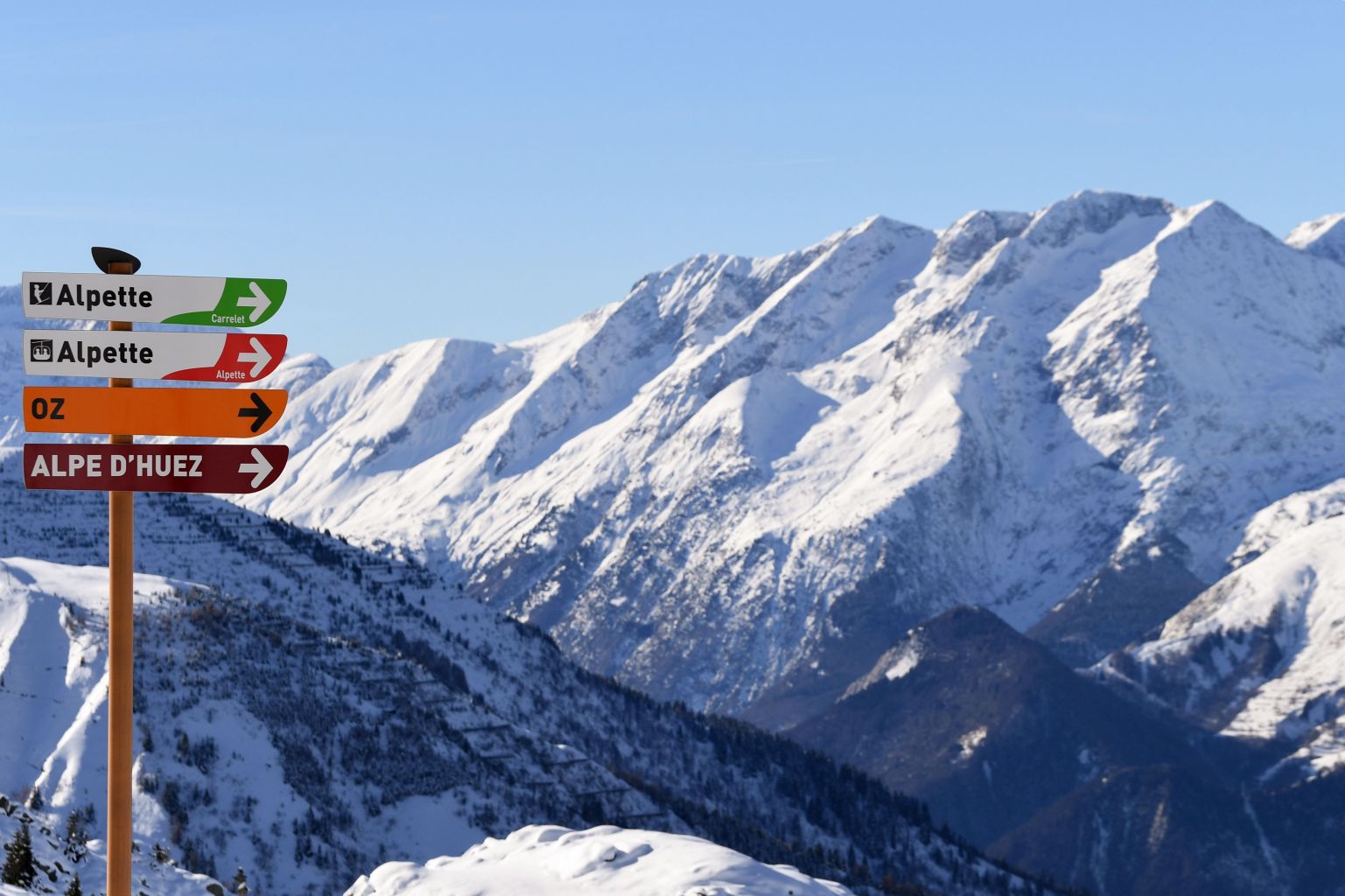 Tracks signs for skiers are seen in Vaujany, in the French Alps.