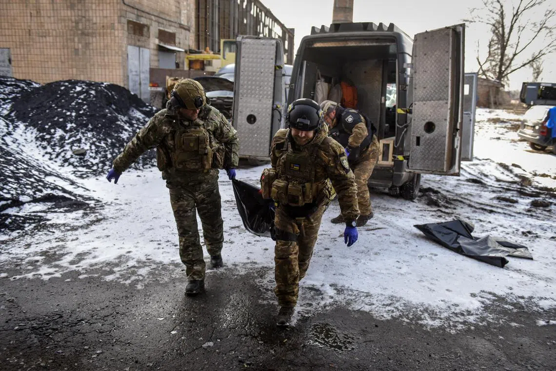 Members of Ukraine’s White Angels Police unit move the remains of a person who died during shelling in Bakhmut, eastern Ukraine, on Jan 17, 2023.