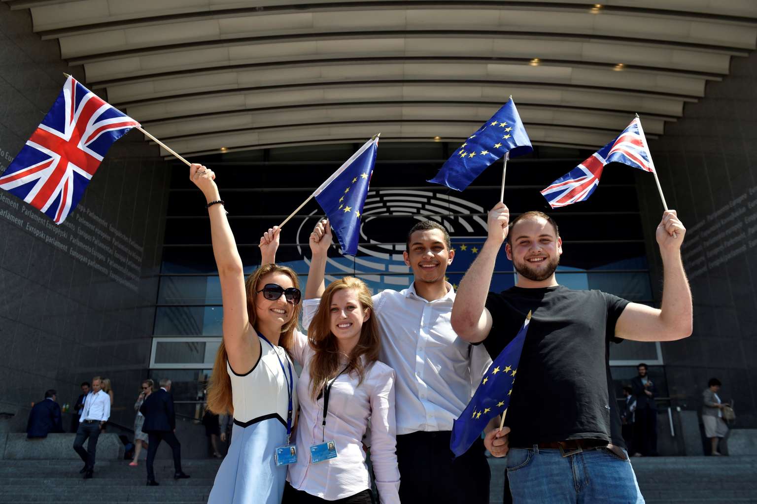 British students hold British and European Union flags in front of the European Parliament in Brussels, Belgium, June 23, 2016.