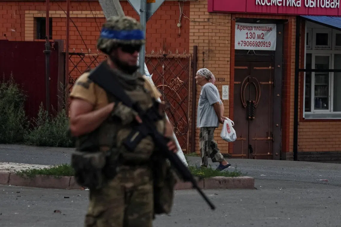 A Ukrainian serviceman patrolling an area in the controlled by Ukrainian army town of Sudzha, Kursk region, Russia on Aug 16.