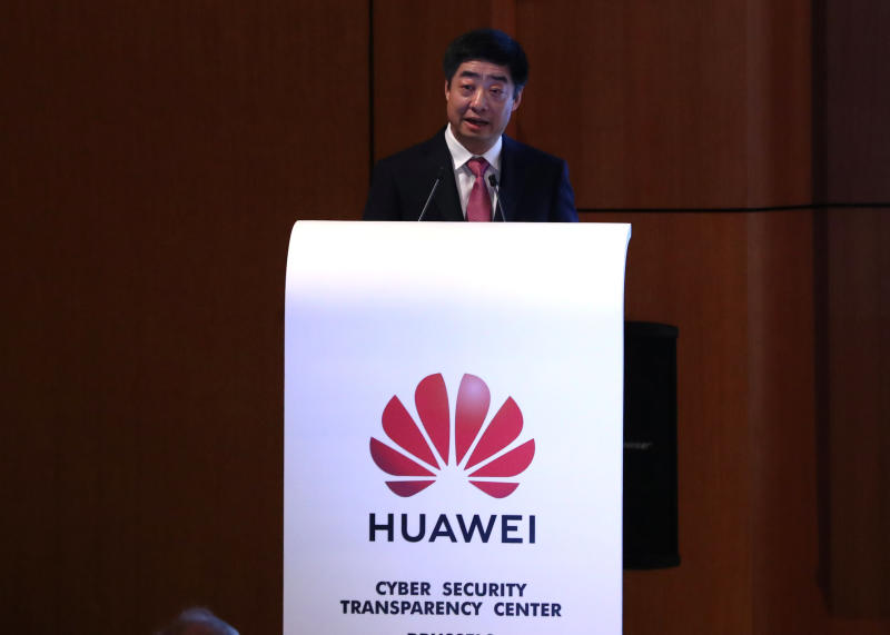 Huawei's Deputy Chairman Ken Hu gives a speech at the opening of the Huawei Cyber Security Transparency Centre in Brussels, Belgium, on March 5, 2019.
