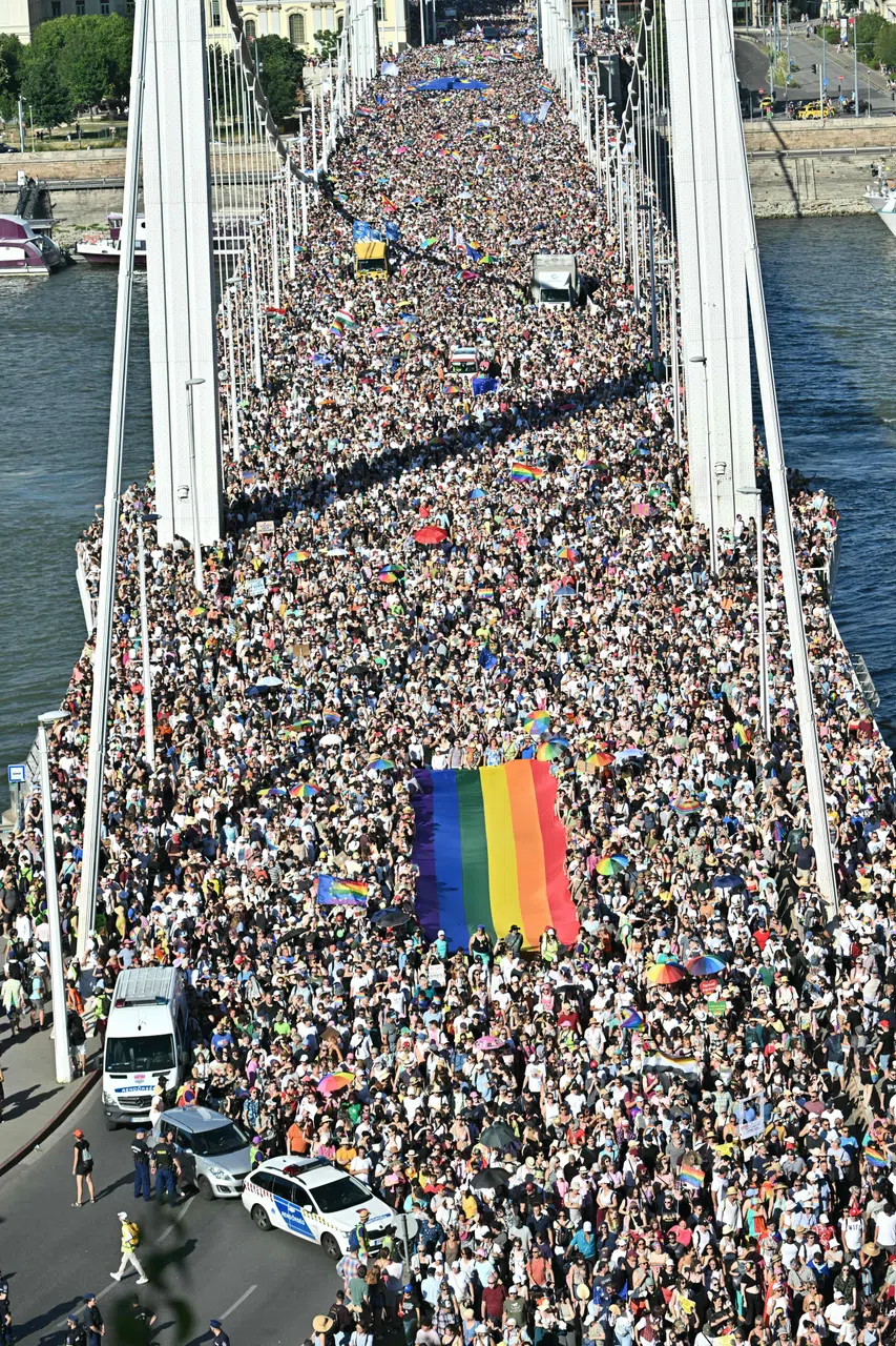 Crowds filled a square near Budapest’s city hall in sweltering heat before setting off across one of the main bridges over the Danube, waving rainbow flags, some draped in capes and some carrying signs mocking Mr Orban.