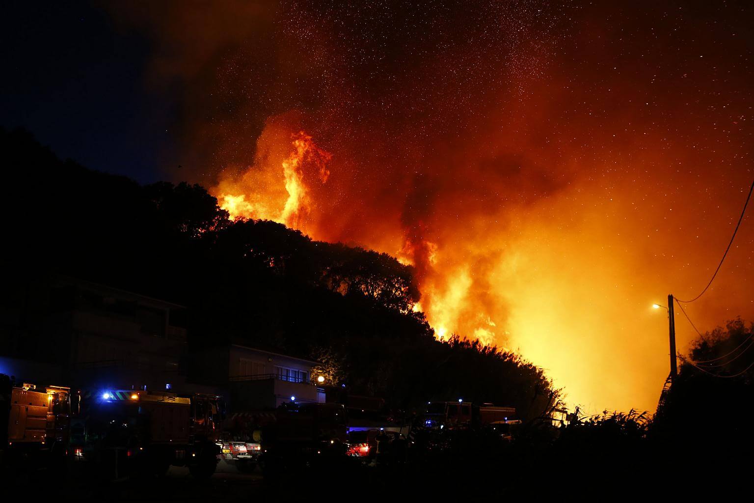 In Corsica, scores of firefighters worked through the night to tamp down a wall of flames that threatened homes in the town of Biguglia in the north-east. The blaze, which consumed 1,500 hectares of forest, engulfed a sawmill and burned several vehicles.