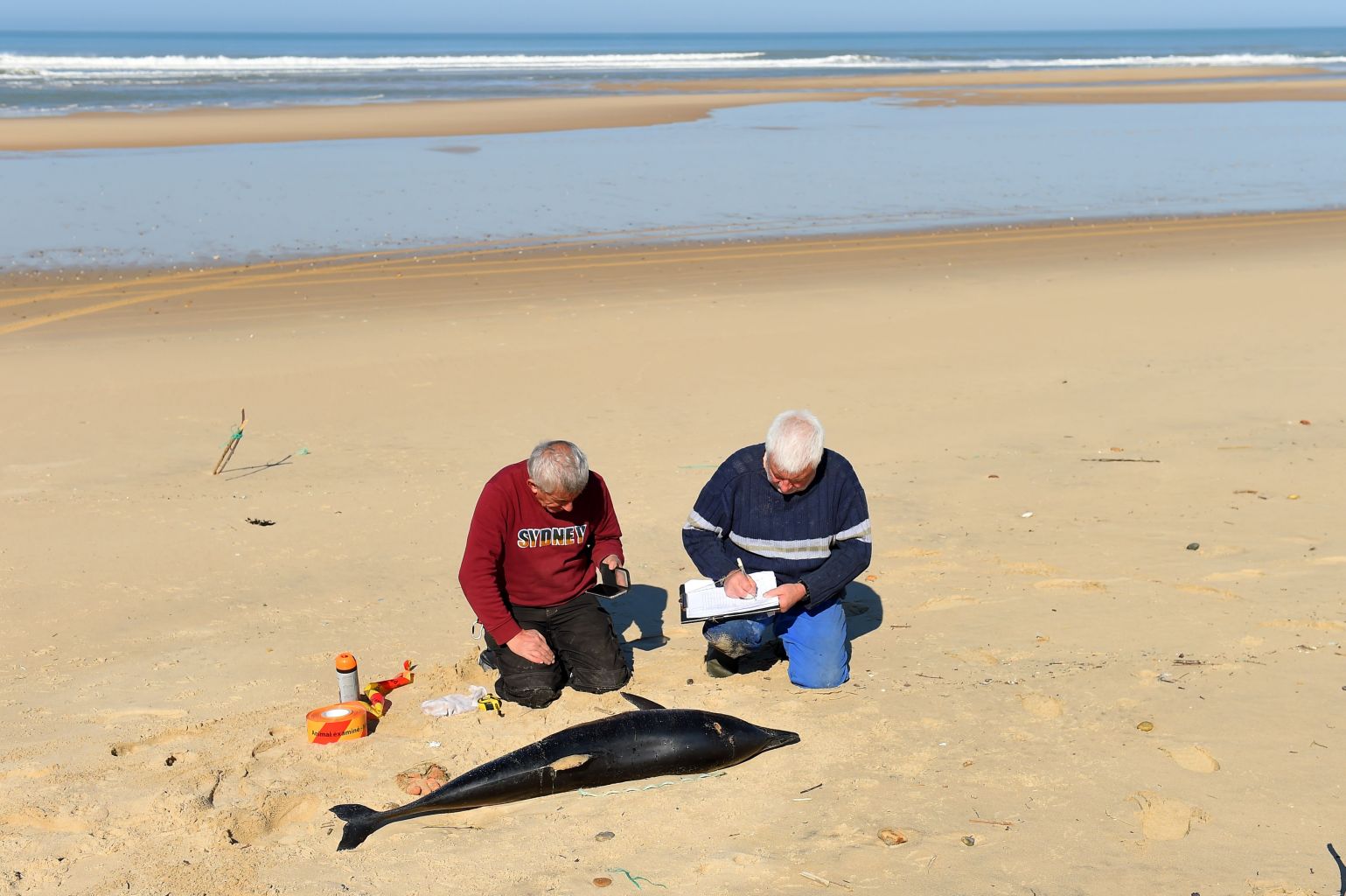 Pelagis Obsevatory volunteers examine a dead dolphin on a beach in southwestern France on March 22, 2019.