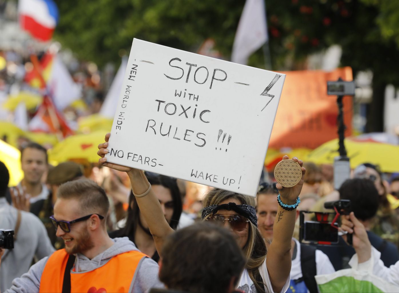 Demonstrators take part in a "freedom" march in Brussels, Belgium, on May 29, 2021.