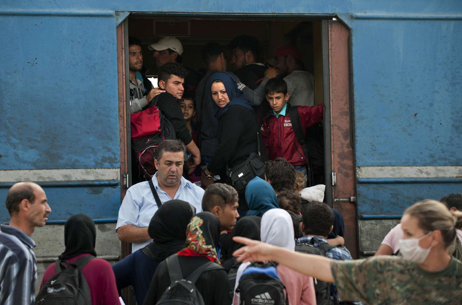 Refugees board a train heading to Serbia near the town of Gevgelija, at the border line between Greece and Macedonia, on Sept 20, 2015.