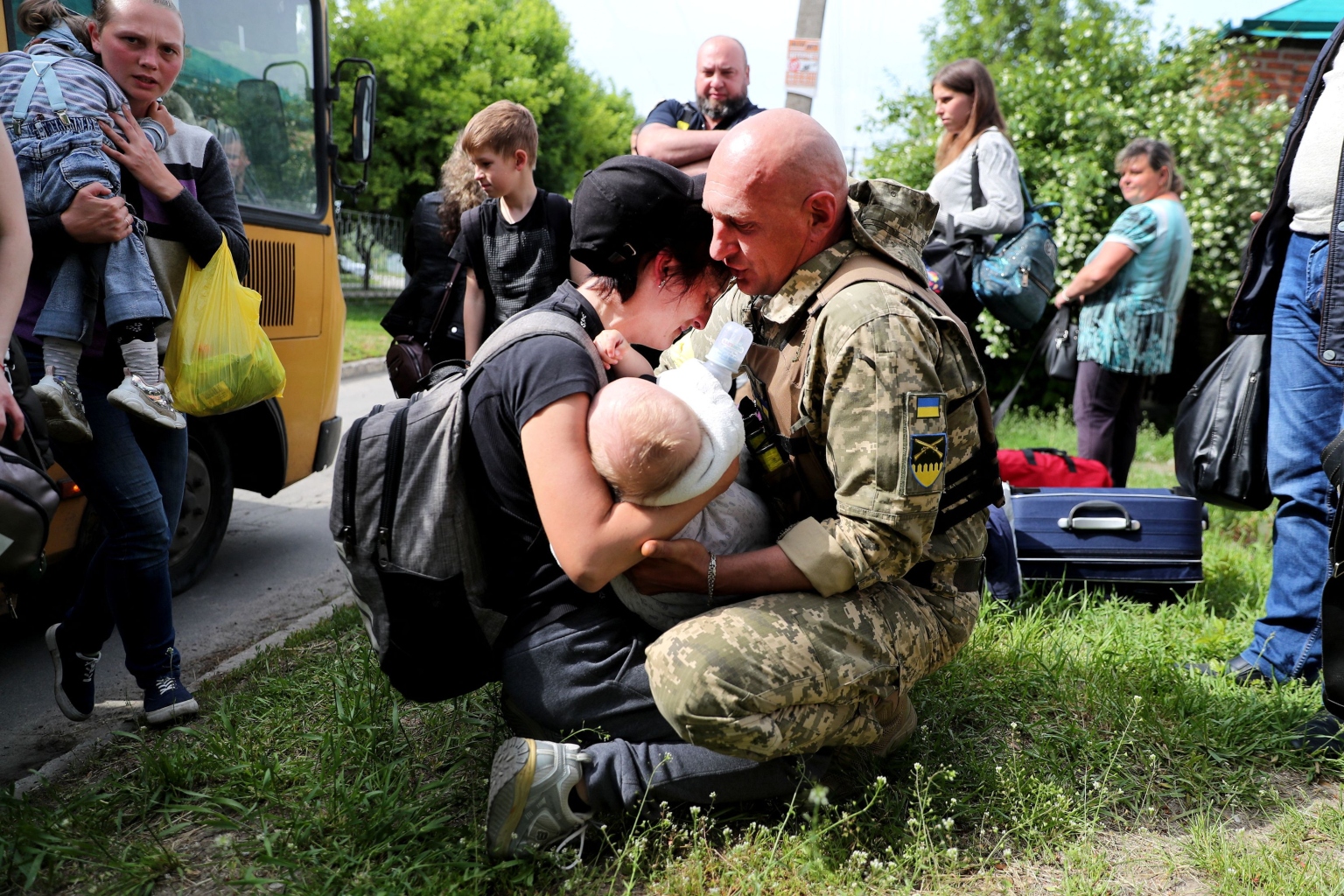 A family reunification takes place after evacuating from Kupiansk town, Ukraine, in a bus convoy, on May 30, 2022.