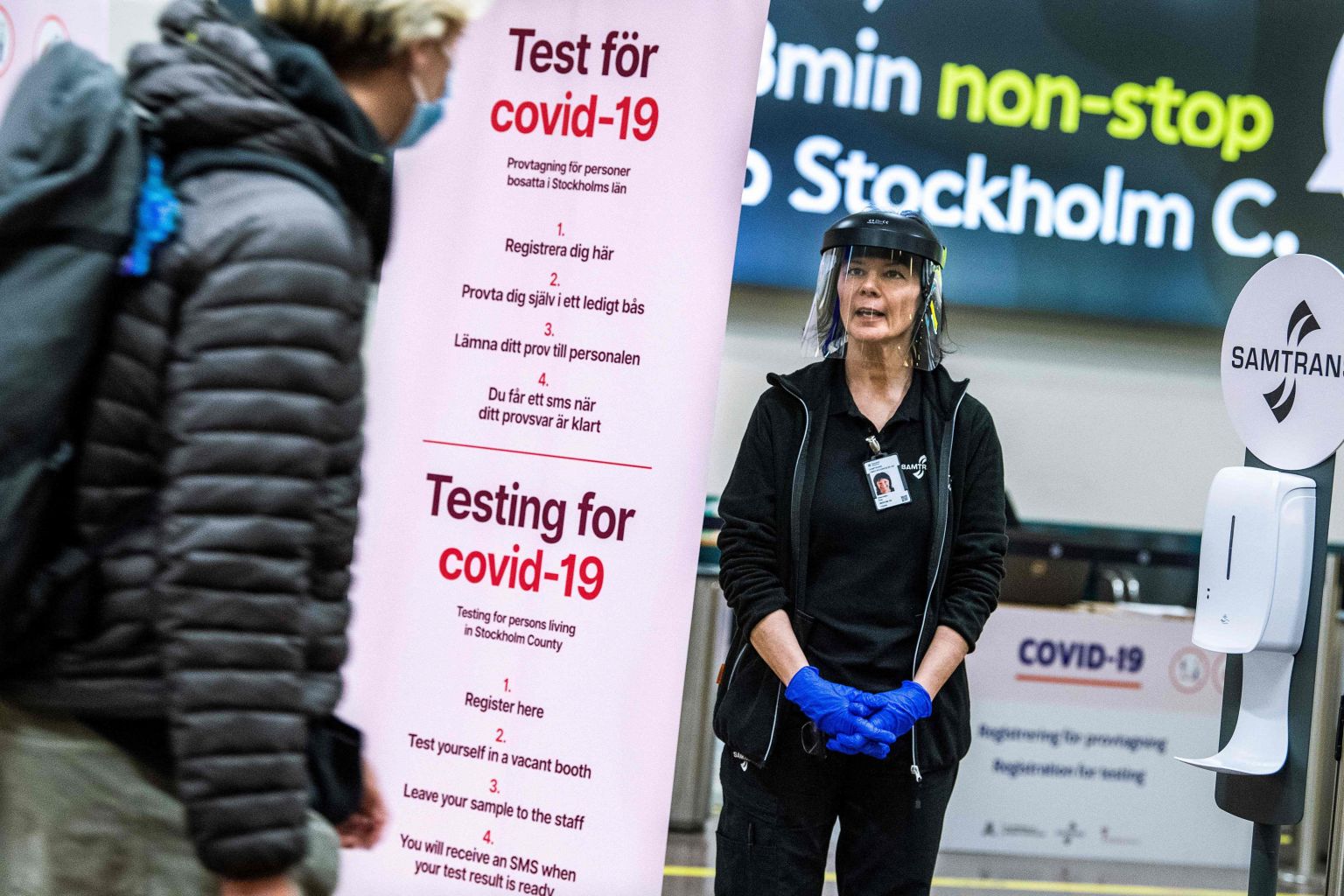 A coronavirus testing zone for travellers who arrive on international flights is pictured at Stockholm's Arlanda Airport.
