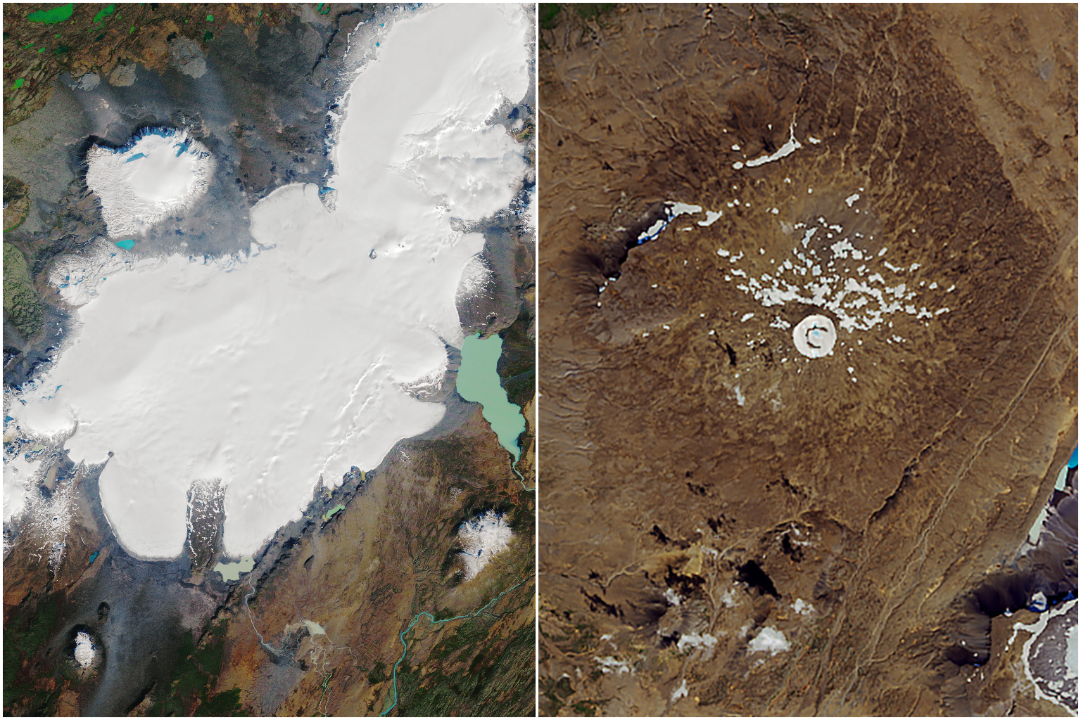Satellite images of Okjokull glacier taken on Sept 7, 1986, (left) and on Aug 1, 2019. Glaciologists stripped Okjokull of its glacier status in 2014, a first for Iceland.