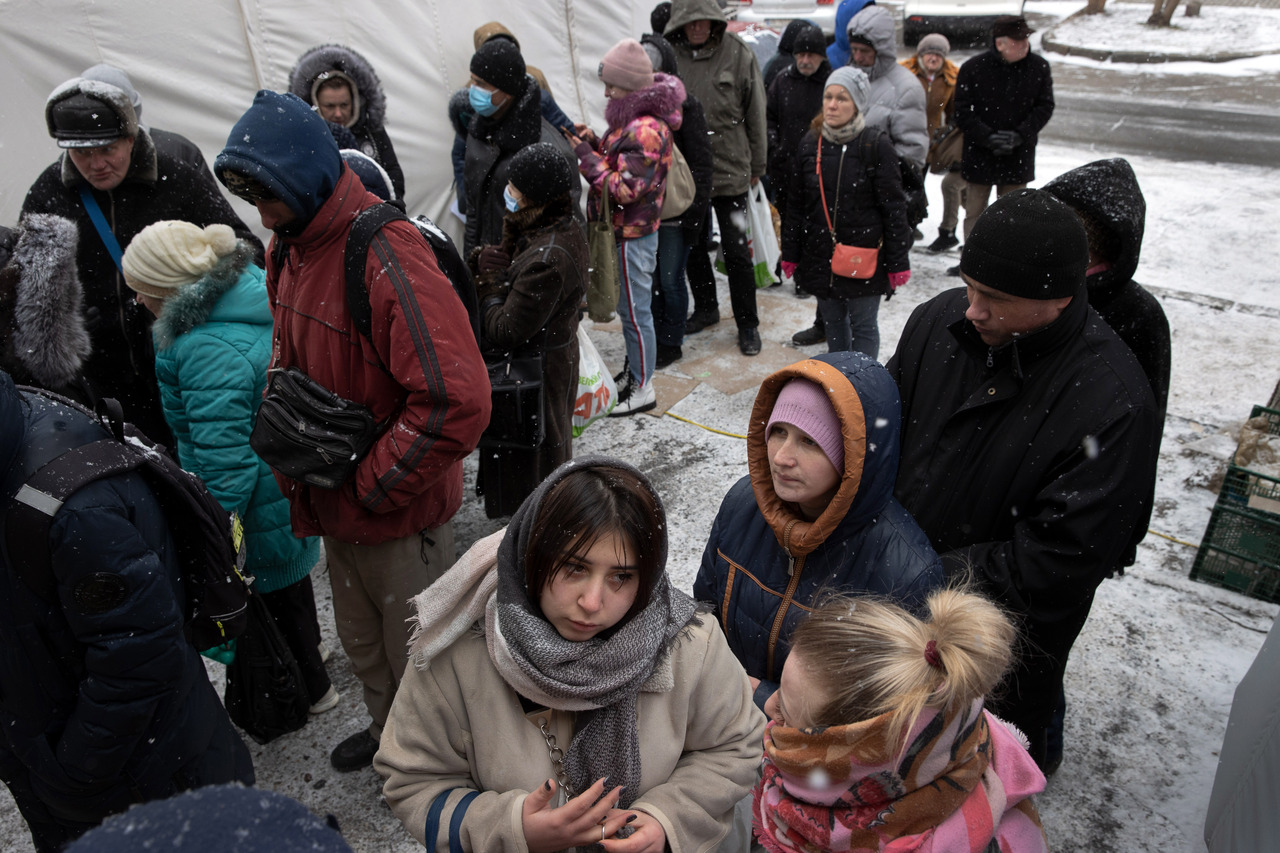 <p>Residents waiting outside a Red Cross encampment in Mykolaiv, Ukraine, on Thursday, March 10, 2022. The port city of Mykolaiv is being shelled by Russian forces every day. Bodies are piled at the morgue. But residents refuse to succumb. (Tyler Hicks/The New York Times)</p>